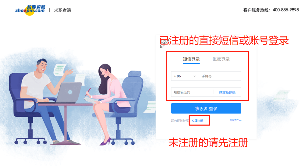 已有智联账号的求职者,选择“账号登录”或“短信登录”;